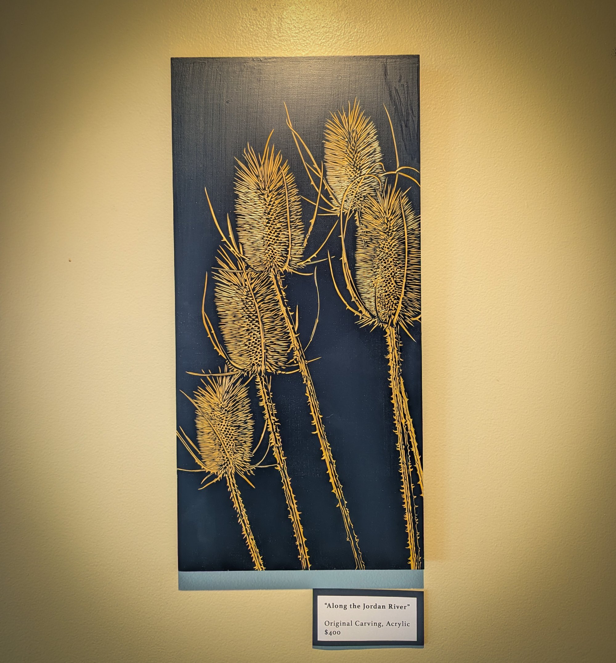 The mother of the print “Along the Jordan River”. After printing a small edition of 6 from this block, I painted the surface of this piece, inked, added gold leaf to the edges, and sealed it. A teasel treasure to adorn your walls for many years.