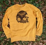 This cozy pullover is printed with a black oil based ink from a hand carved linoleum block. Alternative Brand French Terry style, this sweatshirt is easy to layer or lounge in. Available on a golden mustard color. Best care practice is to wash and dry on low temperatures, wear in the great outdoors.