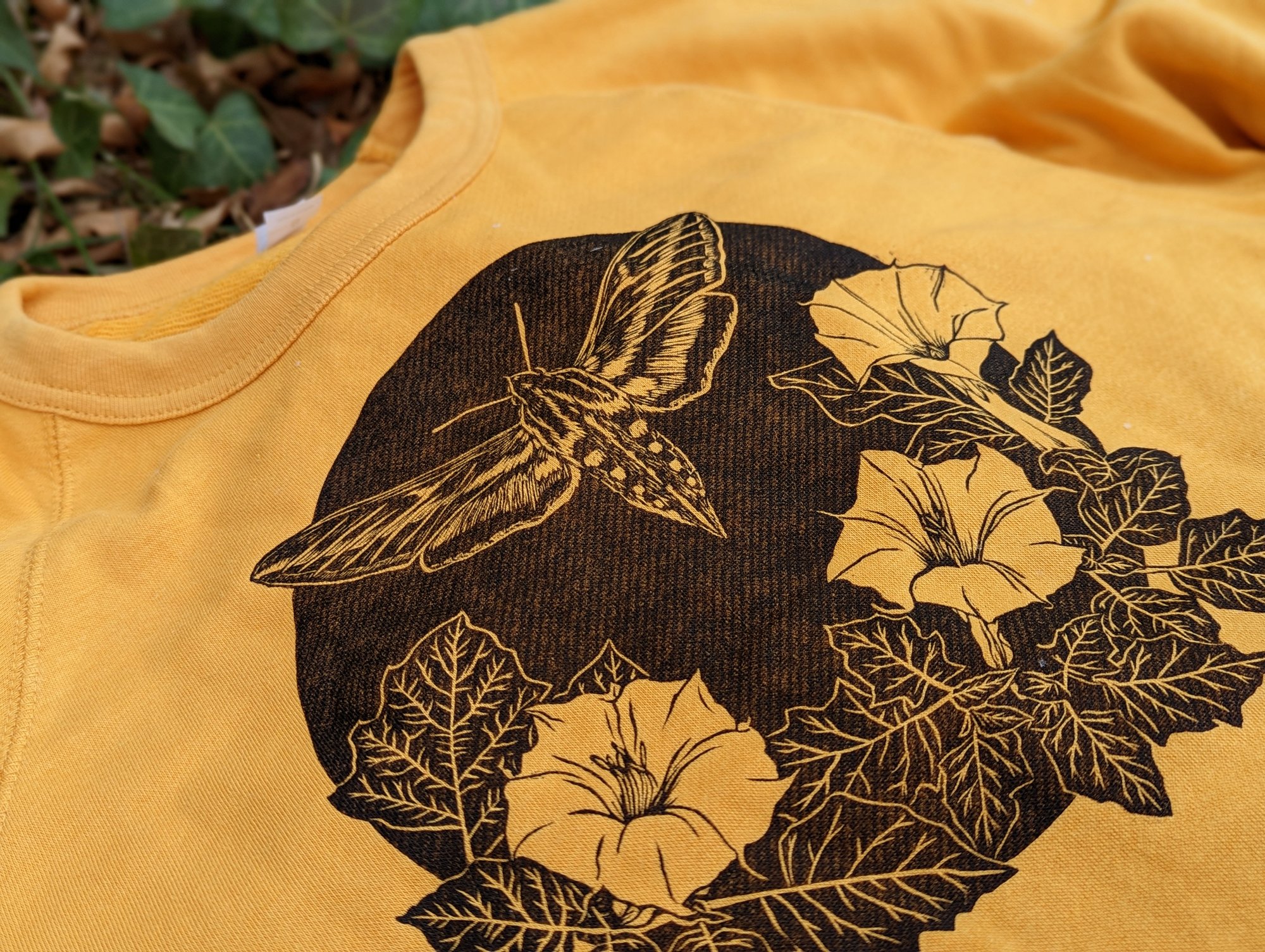 This design is an ode to the Sphinx Moth, aka Hummingbird Moth, and its beautiful symbiotic relationship with the Datura plant, known for blooming at night under the moonlight. I was lucky enough to witness these creatures thriving together while on a river trip down the Grand Canyon.