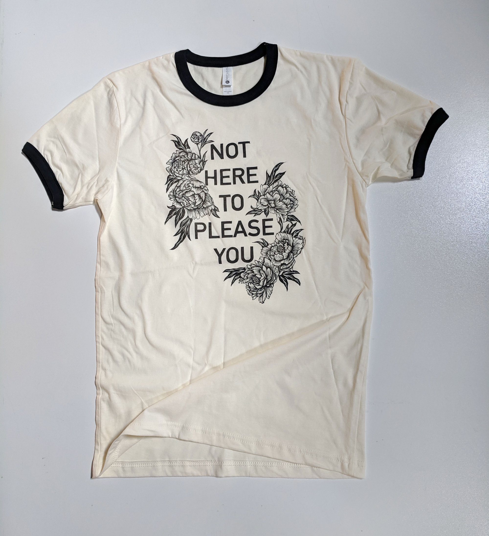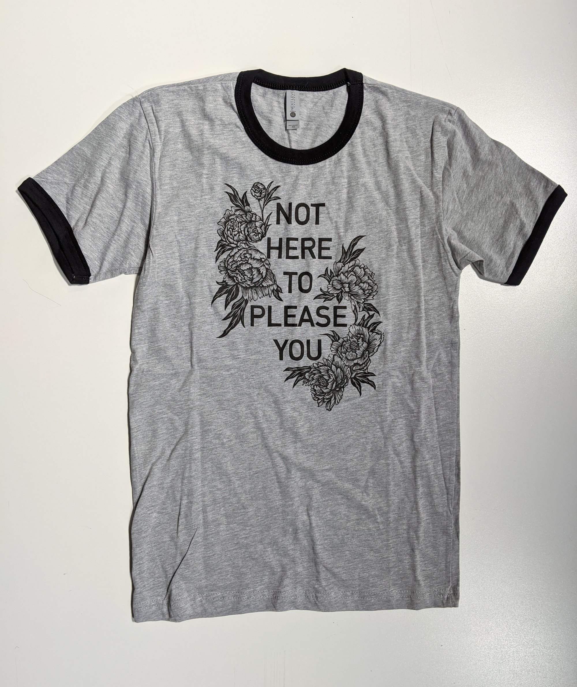 This shirt style is Next Level Brand Unisex sized Ringer T, natural color or grey with black trim, printed in black ink. Please double check the sizing chart before ordering. I find this style runs large. Model is wearing XS.