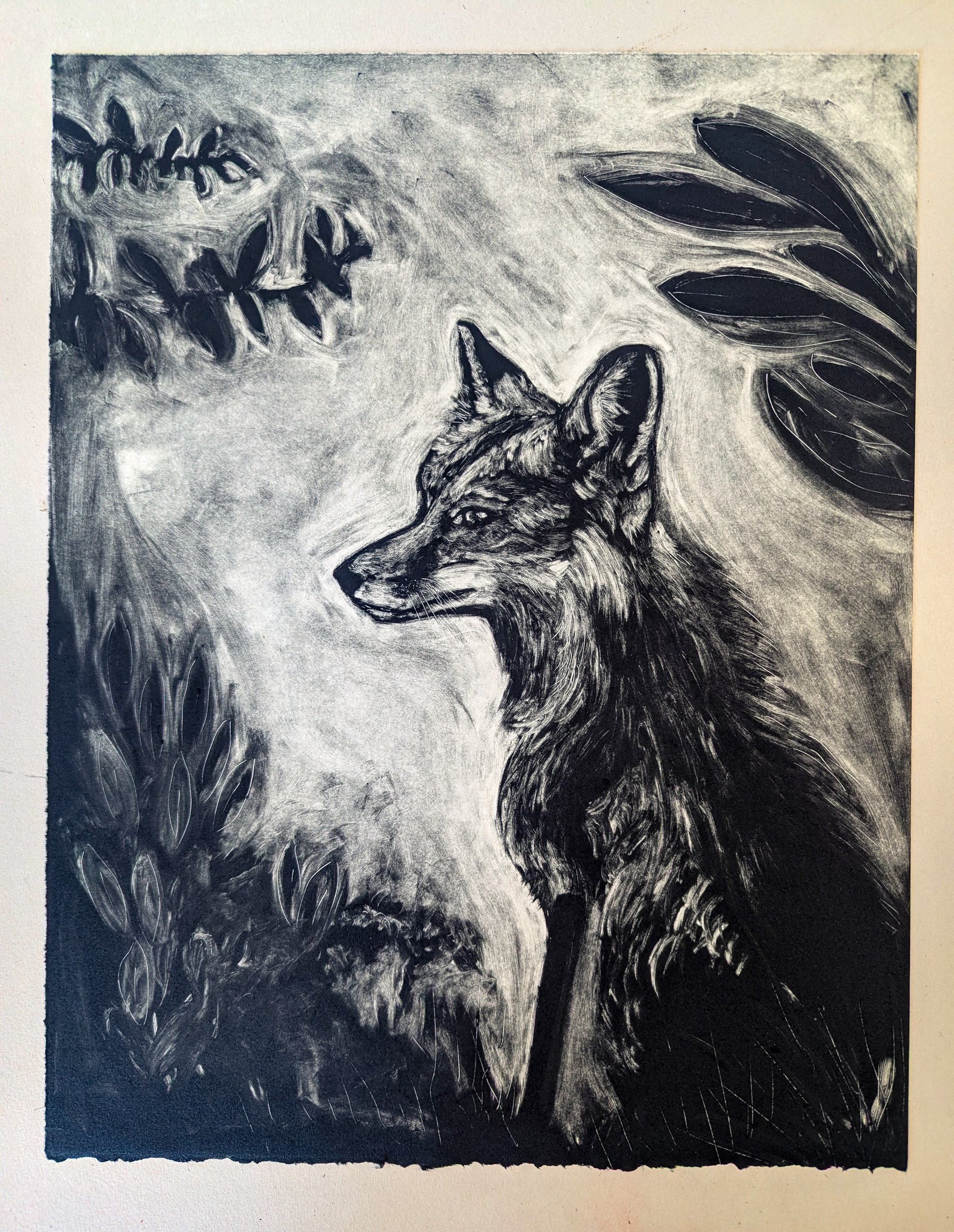 Monotypes are a process of printmaking that involves coating a flat printable surface, in this case plexiglass, with ink. The ink is then drawn into, wiped away, and otherwise given texture, light, and shadow to create an image. The plate is run through a press with a soft cotton-rag paper to print the ink onto the paper. Each print is framed in a 1"x1" flat black wooden frame with a floating mount and UV protective glass.