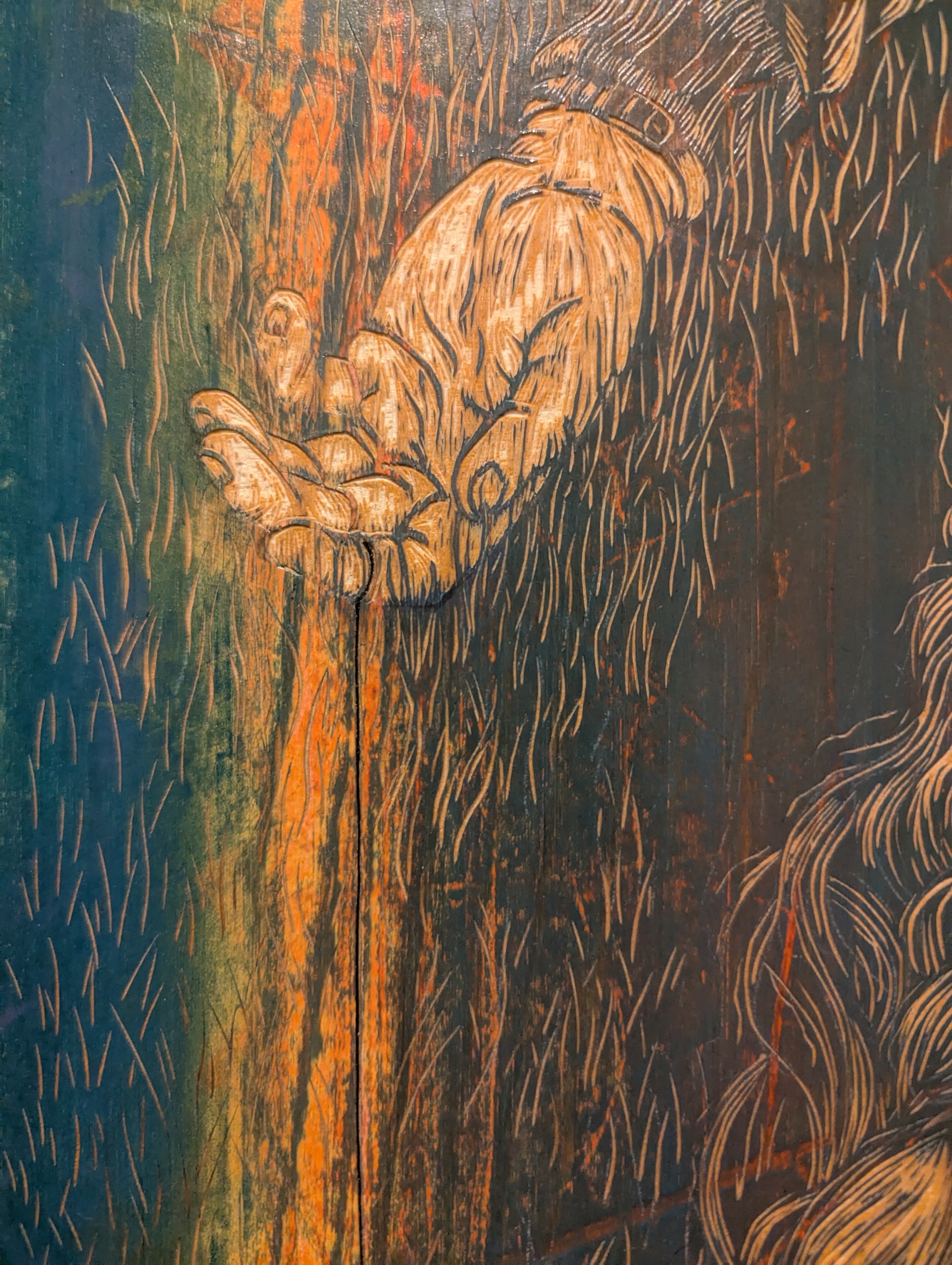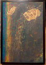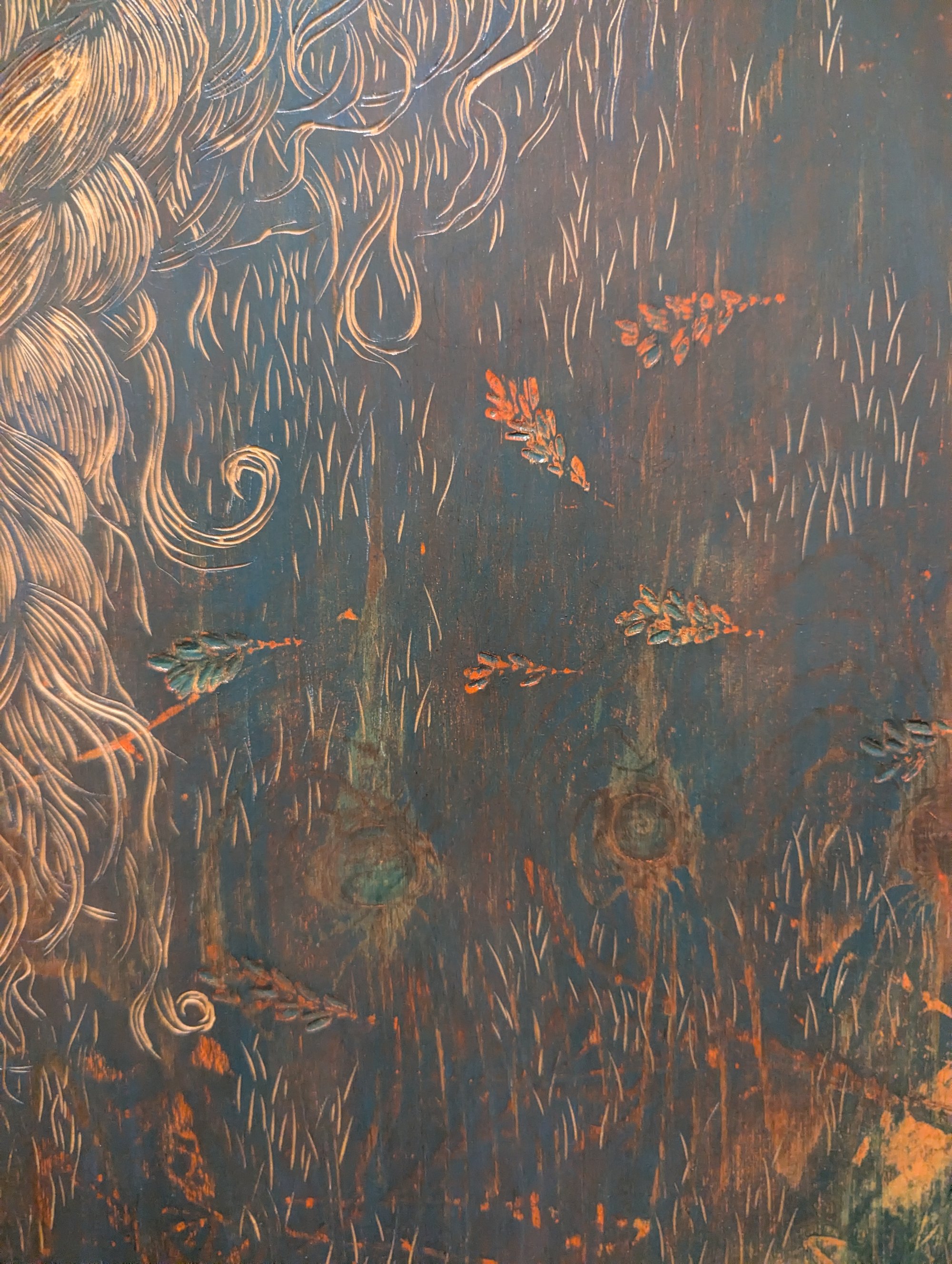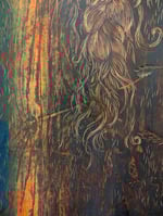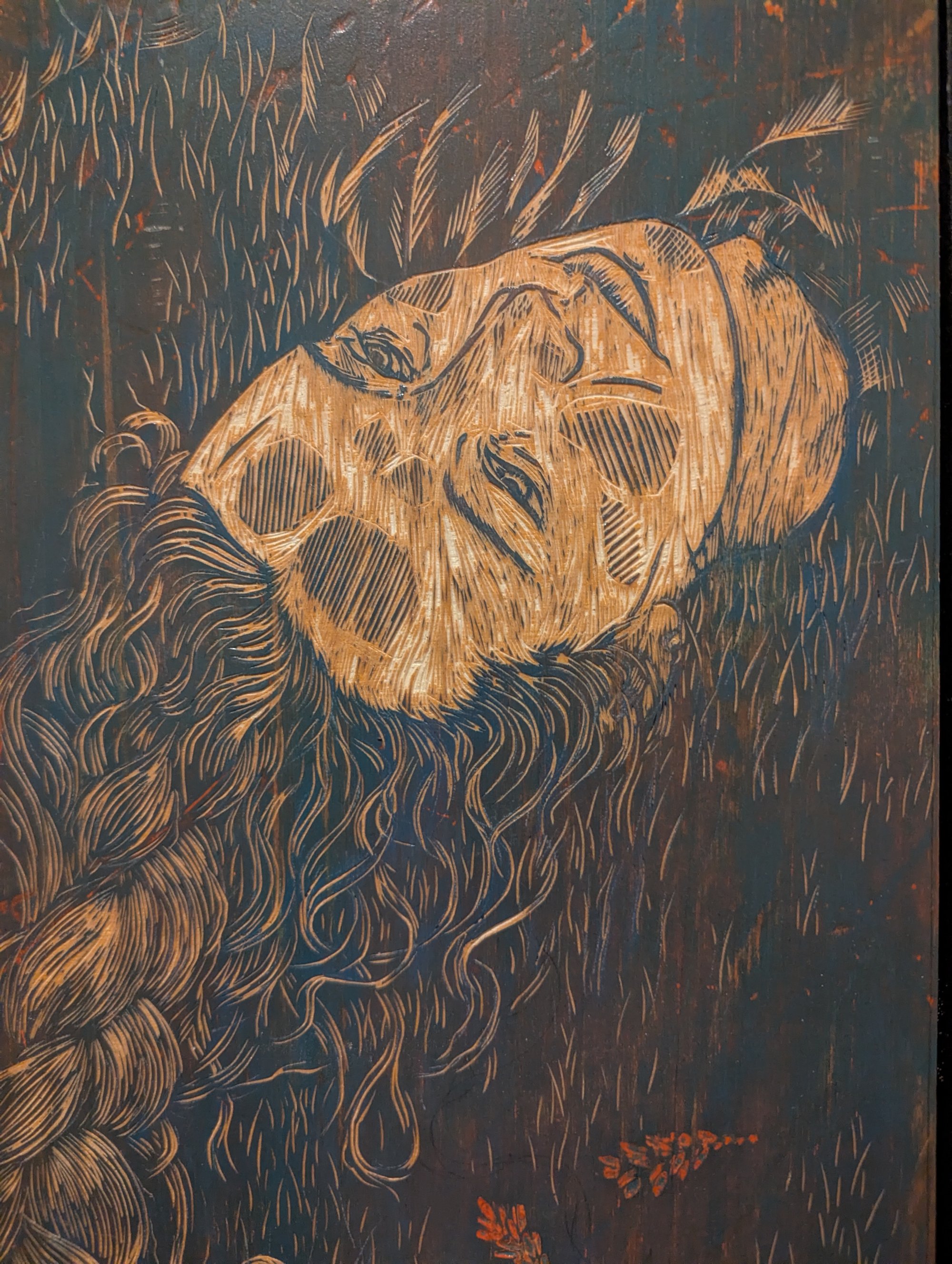 The Artist’s self portrait; this image is meant to convey the sense of loss and letting go of what was once seen as a family tradition and identity. The loose braid slowly unfurling, signifying the release of religious expectations, while laying on the ground, gazing up, feeling a sense of peace. The small detail of a thread tied to her finger, as a reminder, that not all things are easily forgotten or let go of.